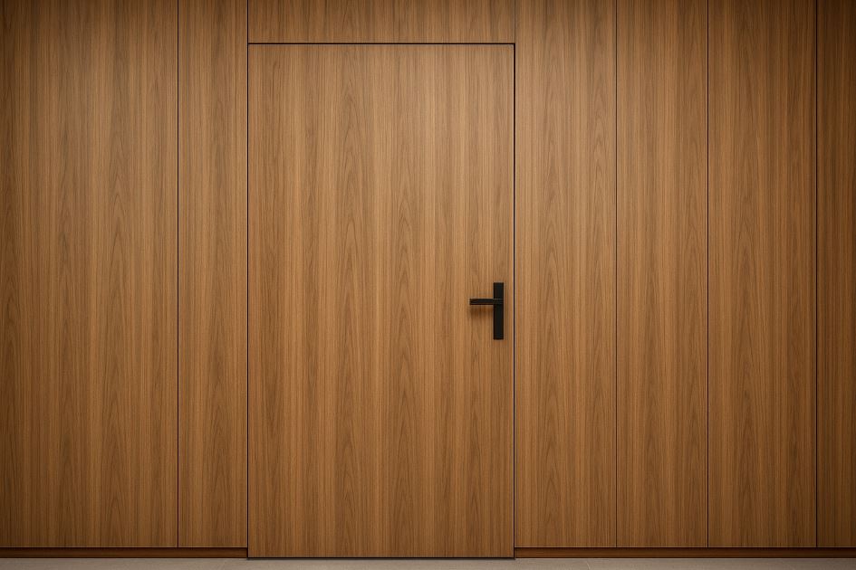 - 深色木皮/繃布門面+暖光壁燈洗牆;門縫藏在金屬細框節奏裡。