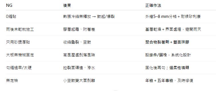 杜絕「磁磚雨」,靠的是對的系統:合適的面材、乾燥穩定基層、高覆蓋率黏著、必要的機械固定、可呼吸的伸縮縫與可追溯的驗收與保養。