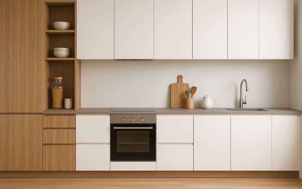 板材多採防潮、防刮耐熱材質,搭配緩衝五金與收納配件,如拉籃、轉角架、刀叉收納盒等,讓烹飪流程更順暢。整體設計不僅提升使用效率,也讓廚房成為家的美學中心。
