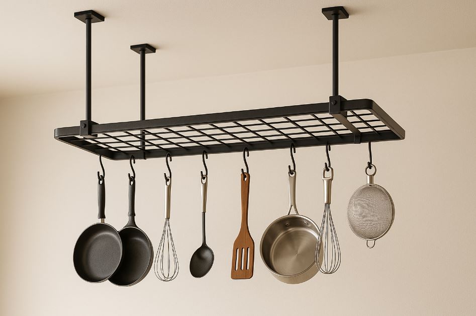 中島吊架安裝於「中島上方」,具有掛放鍋具、展示酒杯、收納物品或放置裝飾的多功能特性。