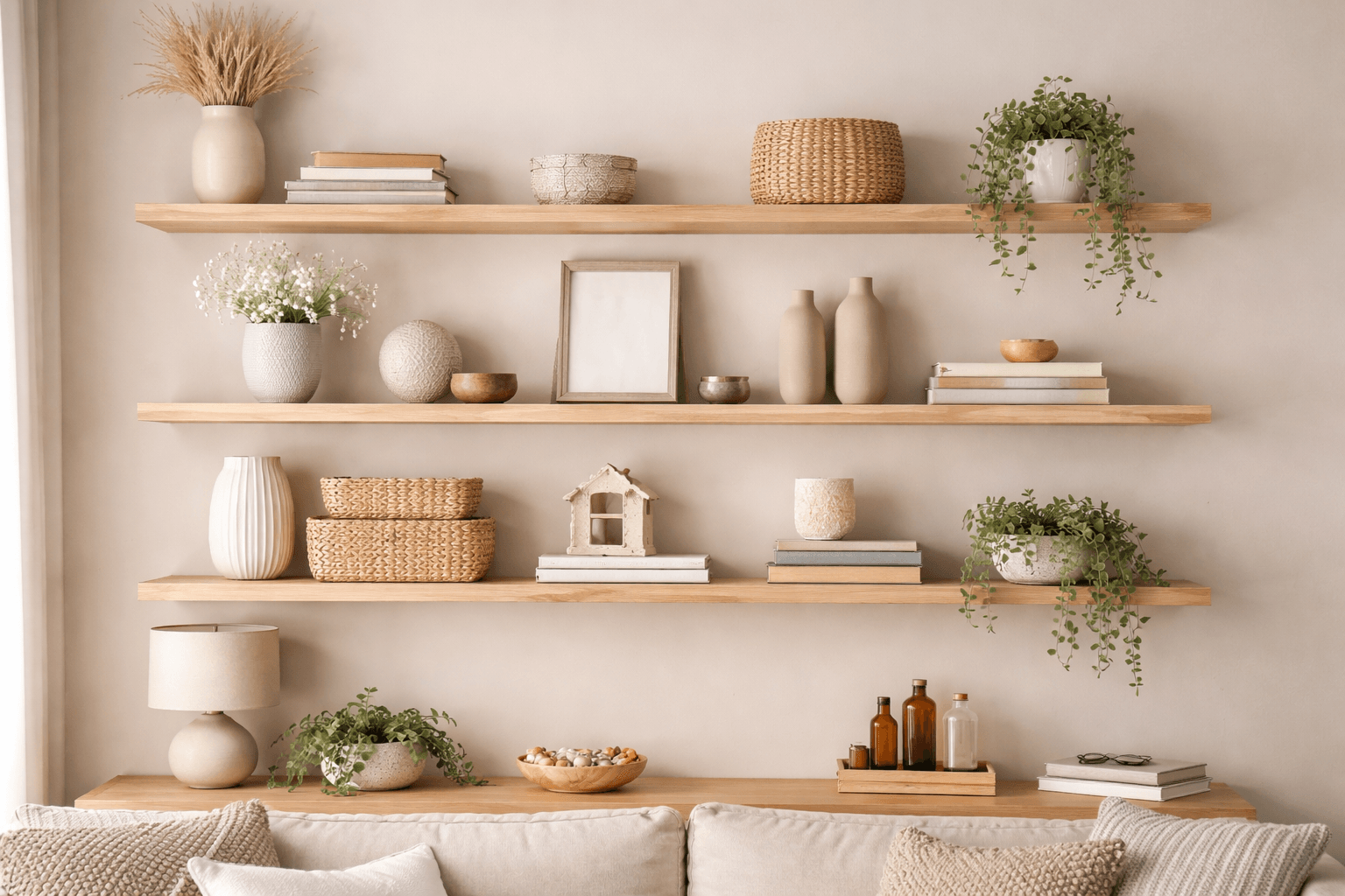 層板設計若想好看,數量、排列與展示內容都要適度留白,避免整面牆塞滿物品造成壓迫。