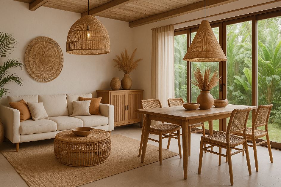 用白+大地+深木控制色階,選耐用的仿石與木皮/藤編,配吊扇與分層照明,再以綠植與水意收尾,你的家就能長住也有度假感。