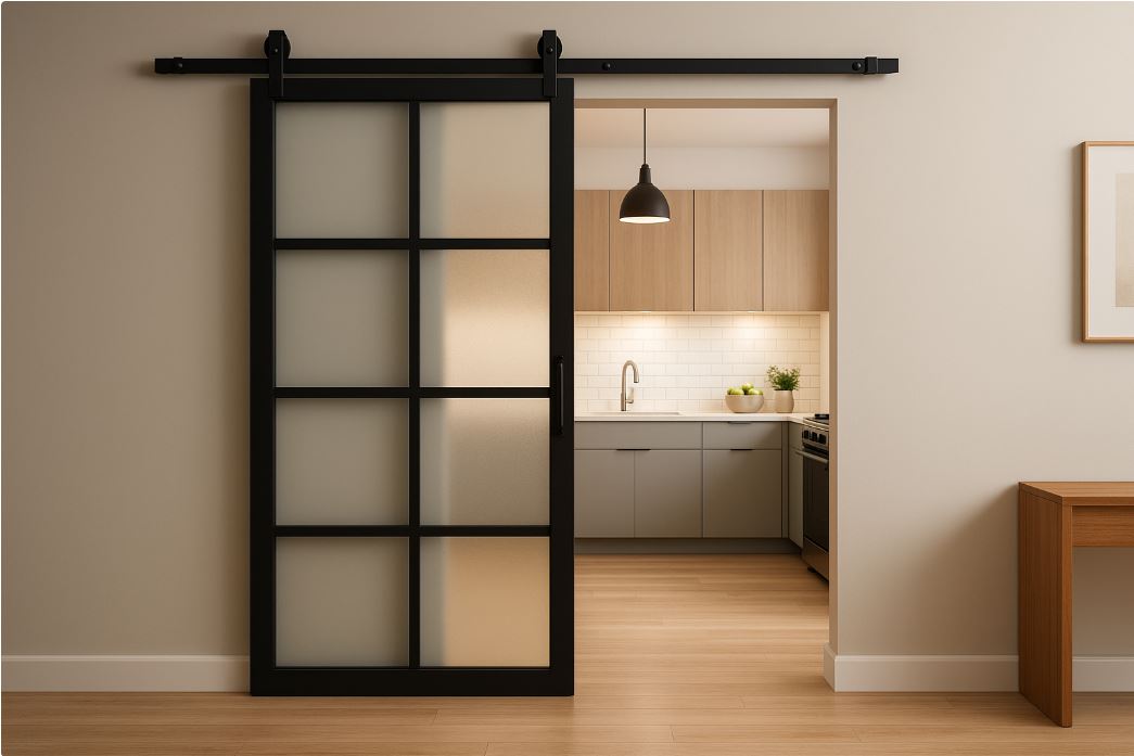 這類懸吊拉門常應用於餐廳、工作室或書房空間中,能創造個性鮮明又具現代感的視覺焦點。