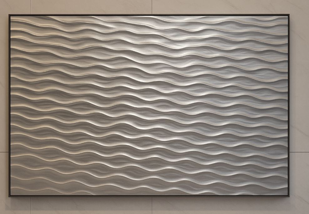 金屬材質的水波紋板是目前市場上最具高級感的材質之一,常見為 鋁板水波紋 與 不鏽鋼水波紋。其表面具有強烈反射效果,能營造奢華、精品般的光影層次,常用於飯店大廳、旗艦店、餐廳櫃台與展示空間。