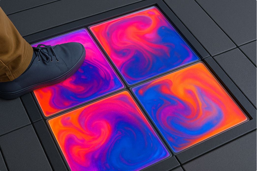 當人踩踏後,磁磚內部的液體流動、擴散,呈現如水波、油墨、霓虹、星雲等效果,是傳統磁磚、木地板或 PVC 地板無法取代的特色。