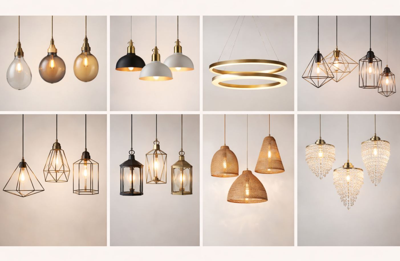 霧金+乳白玻璃、黑鈦+煙燻玻璃、木質+布罩。混材質能讓吊燈更像精品,而不是單純照明設備。