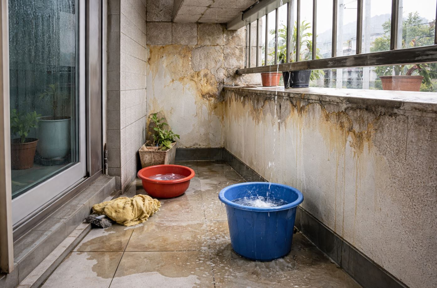 事實上,陽台一旦漏水,不只是地板濕滑而已,更可能造成室內天花板滲水、牆面壁癌,甚至影響結構安全。