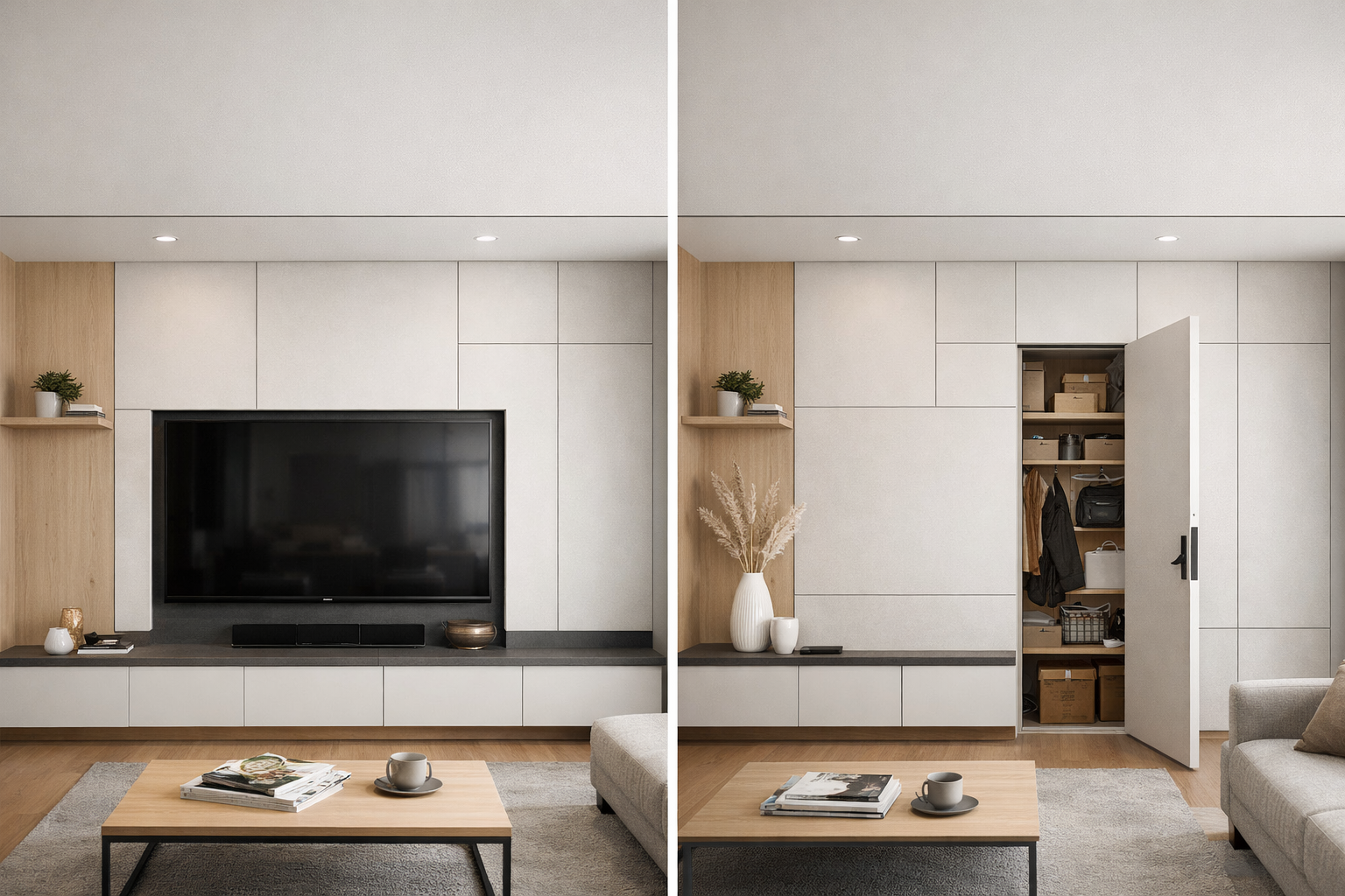 隱藏門常會和電視牆造型、格柵、木皮、塗料或收納櫃一起規劃,讓門不只是被藏起來,而是成為設計的一部分。